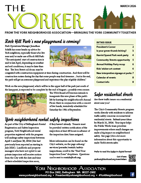 The York Neighborhood Association (YNA) exists to preserve and enhance the community and engage citizens in civic affairs. We work to promote a safe, comfortable, and thriving urban neighborhood bordering downtown Bellingham, Washington.